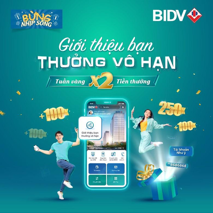 - Tăng thêm combo quà tặng trị giá 250k cho người được giới thiệu, bao gồm: 04 mã giảm giá QR Pay/VnShop trị giá 50.000đồng/mã; hoàn 50% giá trị thẻ nạp đầu tiên trên BIDV SmartBanking (tối đa hoàn 50.000 đồng).