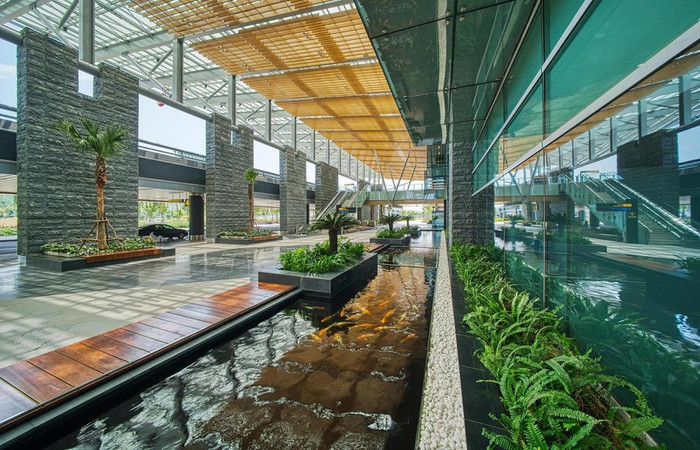 Khu vườn treo xanh mát và hồ cá koi trong khuôn viên nhà ga hành khách là những điểm nhấn đặc biệt riêng có của sân bay Vân Đồn, mang tới không gian nghỉ ngơi, thư giãn cho du khách sau những chuyến bay dài.