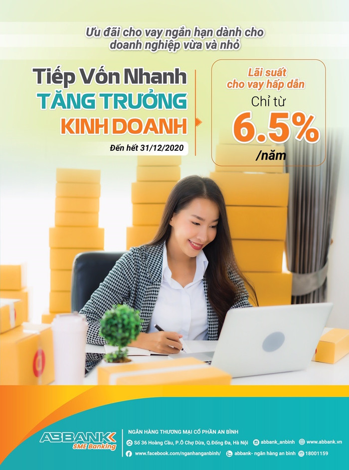 Nhằm đồng hành cùng các Doanh nghiệp vừa và nhỏ (SMEs) trong việc tái khởi động và thúc đẩy sản xuất kinh doanh năm 2020, Ngân hàng Thương mại Cổ phần An Bình (ABBANK) dành 2.300 tỷ đồng triển khai chương trình "Tiếp vốn nhanh - Tăng trưởng kinh doanh" với lãi suất cho vay ưu đãi chỉ từ 6,5%/ năm.