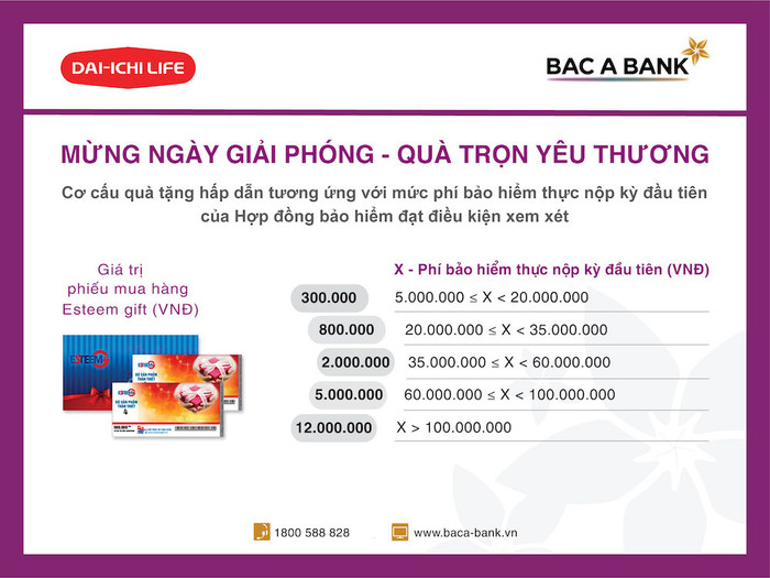 Với nền tảng dịch vụ xuất phát từ sự chuyên nghiệp và tận tâm, BAC A BANK và Dai-ichi Life Việt Nam gửi tới khách hàng vô vàn ưu đãi hấp dẫn trong khuôn khổ Chương trình khuyến mại “Mừng ngày Giải Phóng - Quà trọn yêu thương”.