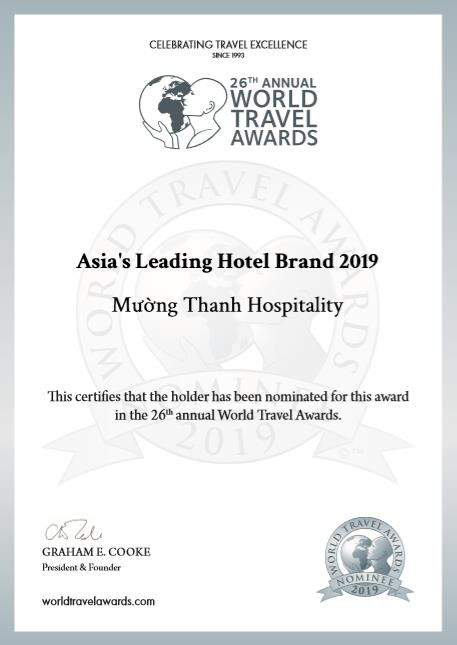 Theo thông tin từ Tổ chức Giải thưởng Du lịch Thế giới (World Travel Awards – WTA), hệ thống khách sạn thuộc tập đoàn Mường Thanh tiếp tục là thương hiệu Việt duy nhất lọt vào danh sách đề cử giải thưởng WTA – “Thương hiệu khách sạn hàng đầu châu Á năm 2019.”
