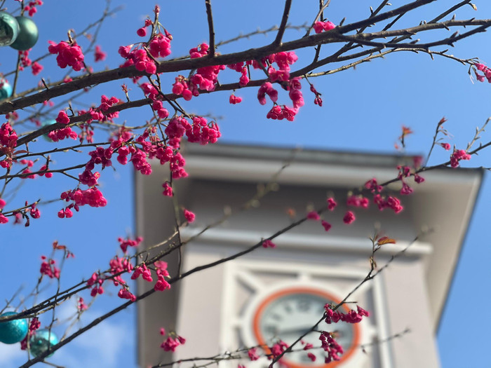 Từng chùm hoa anh đào Himalaya hồng thắm nổi bật trên nền tháp đồng hồ ngay phía ngoài Sun World Fansipan Legend mang đến một khung hình lãng mạn như thể chốn Phù tang, đốn tim những lữ khách du xuân dịp này.