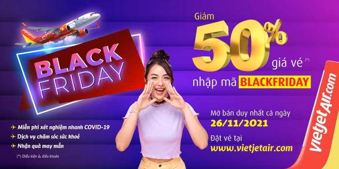 Trong một ngày duy nhất 26/11/2021, nhập mã "BLACKFRIDAY" và khách hàng sẽ nhận ngay ưu đãi vé 0 đồng (*) khi đặt mua vé máy bay Vietjet trên website chính thức www.vietjetair.com, ứng dụng điện thoại Vietjet Air, Facebook page www.facebook.com/vietjetvietnam (mục “Đặt vé”) với thời gian bay từ 01/12/2021 – 28/03/2022. Đặc biệt, khách hàng sẽ được miễn phí thanh toán khi đặt vé và thanh toán qua ứng dụng Vietjet SkyClub – chương trình dành riêng cho khách hàng thân thiết của Vietjet.