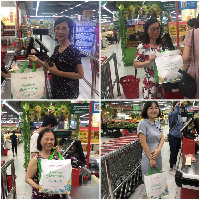 Những “khách hàng xanh” đầu tiên đồng hành cùng VinMart, từ chối sử dụng túi nilon dùng một lần tại quầy thu ngân thích thú khi được tặng túi VinMart sử dụng nhiều lần.