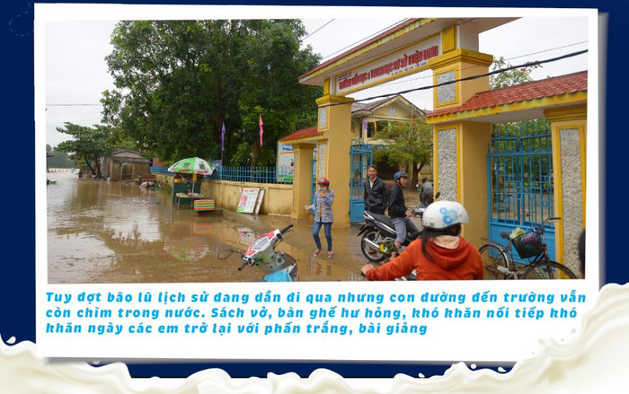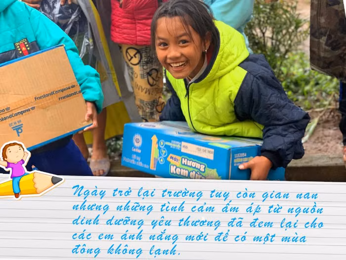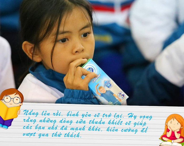 Nhẹ nhàng giở từng trang sách giáo khoa mới tinh, uống hộp sữa Cô Gái Hà Lan, em Hoàng An, học sinh lớp 2 trường Triệu Phong vô cùng xúc động: “Tuần trước cô giáo nhắc đi học lại, chúng con lo lắm vì sách vở mất sạch, đồng phục dính đầy bùn đất, không có tiền mua mới thì làm sao đi học trở lại? Hôm nay có tập mới, sách mới, và cả sữa nữa, yên tâm rồi, con và các bạn sẽ học thật chăm chỉ để không phụ lòng các cô chú quan tâm”.