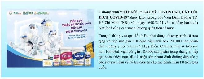 Đây là hoạt động tiếp nối được triển khai trong chương trình 1 triệu sản phẩm Värna “TIẾP SỨC Y BÁC SỸ TUYẾN ĐẦU, ĐẨY LÙI DỊCH COVID-19” được khởi xướng bởi Viện Dinh Dưỡng Thành phố Hồ Chí Minh (NRI) ngày 16/08/2021 và Nutifood cam kết tài trợ kinh phí 16 tỷ đồng.
