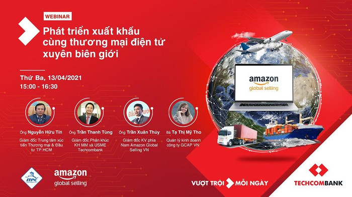 Hội thảo trực tuyến “Phát triển xuất khẩu cùng thương mại điện tử xuyên biên giới” do Techcombank tổ chức được livestream trên Fanpage chính thức của Techcombank vào ngày 13/4/2021 với sự tham gia của các chuyên gia hàng đầu đến từ Techcombank, Amazon Globall Selling, Trung tâm Xúc tiến Thương mại và Đầu tư Thành phố Hồ Chí Minh (ITPC), cụ thể:
