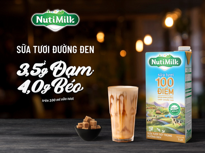 Đặc biệt, sữa tươi 100 điểm đường đen NutiMilk còn có hàm lượng dinh dưỡng vượt trội chứa 3,5g đạm và 4,0g béo trong 100ml sữa, tương đương với tiêu chuẩn thế giới.