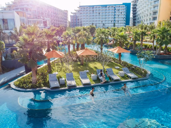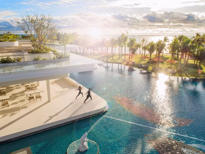 Trái tim của khu nghỉ dưỡng là bể bơi trung tâm tràn bờ rộng 5.000m2 với nhiều cấp độ thoải dần ra phía biển. Từ đây du khách sẽ có cảm giác với tay ra là chạm vào biển cả bao la.