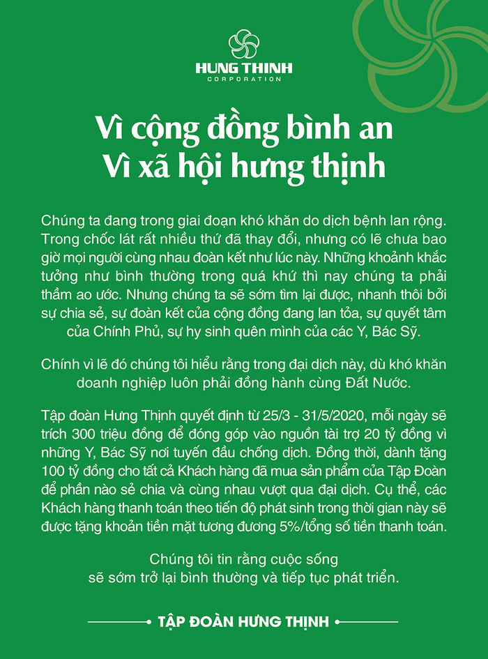 | Mới đây, hưởng ứng phong trào toàn dân chống dịch, Tập đoàn Hưng Thịnh đã ủng hộ kinh phí 5,5 tỷ đồng cho Ủy ban Trung ương Mặt trận Tổ quốc Việt Nam và Uỷ ban Mặt trận Tổ quốc Việt Nam Thành phố Hồ Chí Minh triển khai các hoạt động phòng, chống dịch Covid-19. Tập đoàn Hưng Thịnh cũng là một trong những đơn vị đầu tiên phối hợp với Hội Doanh nhân trẻ Việt Nam và các doanh nghiệp khác huy động 5 tỷ đồng để ủng hộ kinh phí sản xuất 10.000 bộ kit phát hiện virus Covid-19. Trước đó, để góp phần giúp các đối tác vững tâm ổn định kinh doanh, Tập đoàn đã triển khai chương trình hỗ trợ giảm giá thuê mặt bằng trung tâm thương mại tại các dự án do Tập đoàn Hưng Thịnh và các Đơn vị thành viên làm Chủ đầu tư. Theo đó, mức giảm được áp dụng trong 3 tháng (tháng 2 – tháng 4/2020) cho tất cả đơn vị thuê mặt bằng là từ 20% - 80%. Đặc biệt, Tập đoàn còn miễn phí 100% tiền thuê đối với các đơn vị hoạt động trong lĩnh vực giáo dục. |