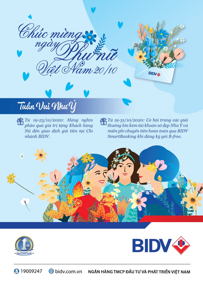 Nhân ngày Phụ nữ Việt Nam, từ ngày 19-23/10/2020, BIDV triển khai chương trình ưu đãi “Tuần vui như ý” dành tặng khách hàng nữ tới giao dịch tại các điểm giao dịch của BIDV trên toàn quốc với hàng ngàn quà tặng là tiền mặt và cơ hội quay số may mắn trúng các giải thưởng giá trị.