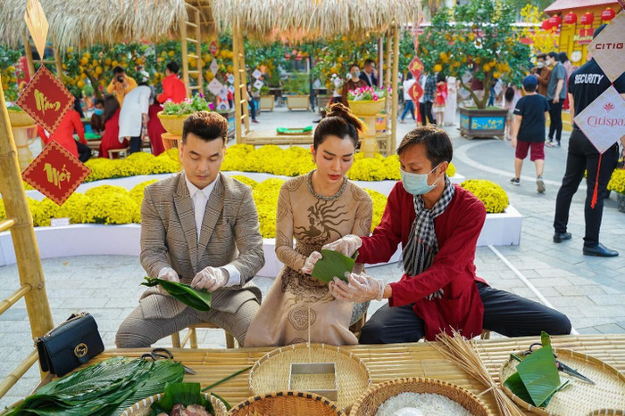 Sau khi thưởng lãm các loại hoa, Ưng Hoàng Phúc và Kim Cương cùng nhau gói bánh chưng như mong muốn một cái Tết sum vầy và đầm ấm tại gian hàng tết truyền thống của Hội Hoa Xuân 2022.