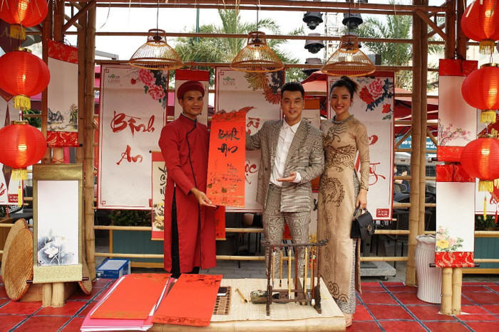 Vợ chồng nam ca sĩ cũng không quên ghé xin chữ ông Đồ cầu mong một năm mới nhiều bình an đến với gia đình và mọi người.