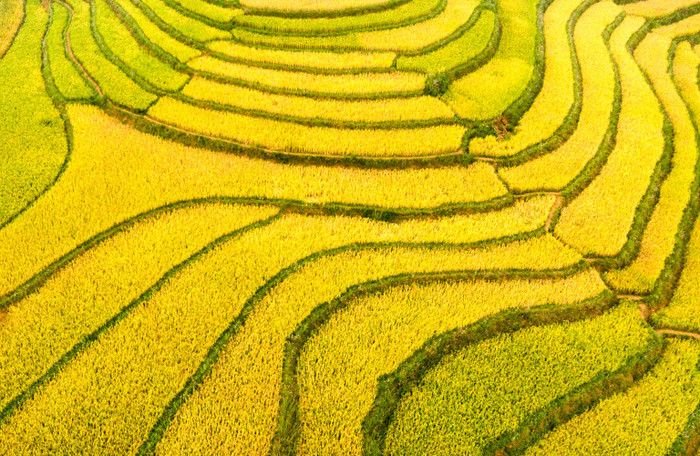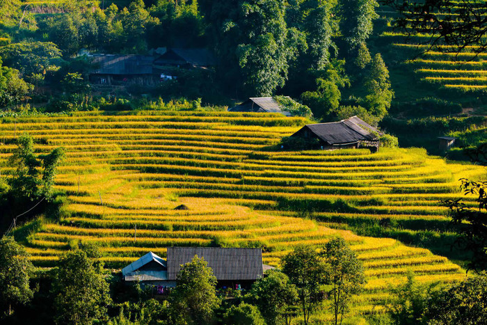 Ở nơi ấy, trong không khí se se lạnh đầu thu, những thửa ruộng bậc thang cao vút tầng mây đang vào vụ thu hoạch, dần chuyển từ xanh thắm sang óng vàng, tựa như những dải lụa mềm mại trải dài từ chân núi đến tận chân trời.