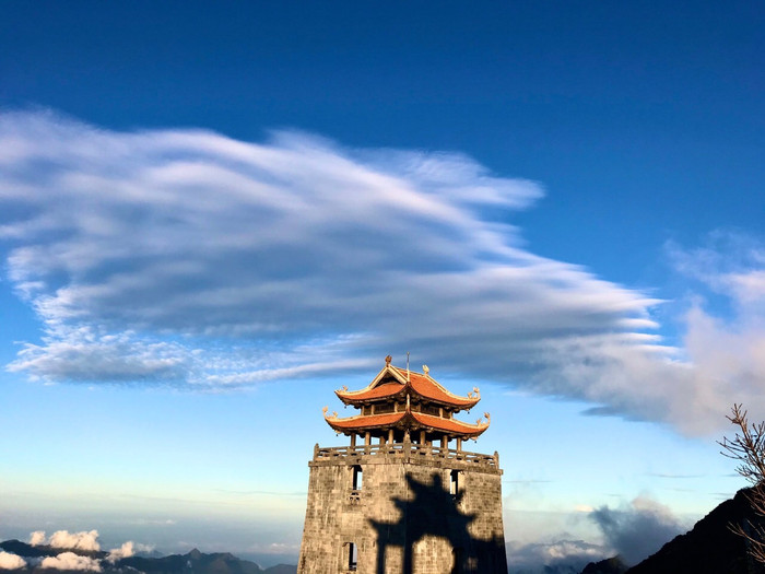 Những đám mây trắng muốt bồng bềnh bao quanh quần thể văn hóa kiến trúc tâm linh kỳ vĩ trên đỉnh thiêng, tạo nên một không gian vi diệu giữa đất trời Tây Bắc.