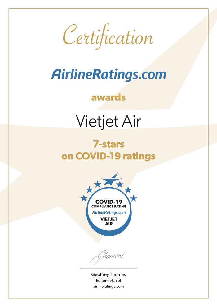 Với hệ thống đánh giá 7 sao, AirlineRatings là một trong các tổ chức tiêu chuẩn đánh giá uy tín nhất trong ngành hàng không thế giới. Trước đó, Vietjet cũng được AirlineRatings đánh giá là 1 trong 10 hãng hàng không chi phí thấp tốt nhất và an toàn nhất thế giới.
