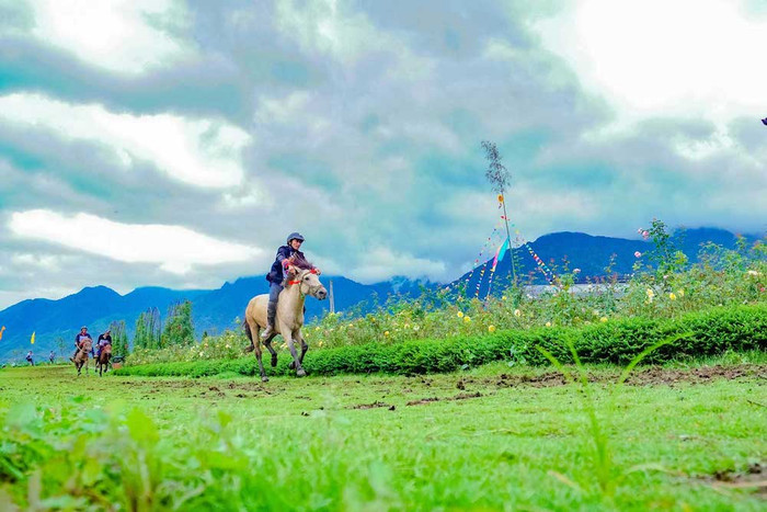 Dưới sự hướng dẫn nhiệt tình của các nài ngựa, du khách được cưỡi lên mình những chú tuấn mã để thảnh thơi ngắm thung lũng hoa hồng đang bừng nở.