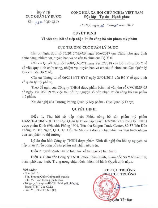 Ngày 26/11/2019, ông Nguyễn Tất Đạt, Phó Cục trưởng Cục Quản lý Dược, Bộ Y tế đã ký quyết định số 727/QĐ-QLD về việc thu hồi số tiếp nhận Phiếu công bố sản phẩm mỹ phẩm của Công ty Trách nhiệm hữu hạn dược phẩm Kinh.