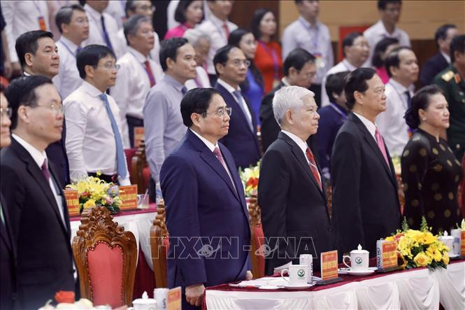| Thủ tướng Phạm Minh Chính và các đồng chí lãnh đạo Đảng, Nhà nước tham dự buổi lễ. Ảnh: TTXVN |