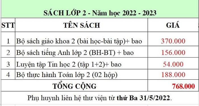 Vị phụ huynh này cho biết, phải mua bộ sách lớp 2 (Chân trời sáng tạo) kèm các tài liệu khác tổng cộng 768.000 đồng. Tương tự, bộ sách lớp 5 hiện hành kèm tài liệu tham khảo là 621.000 đồng.