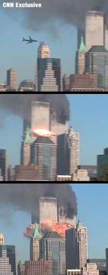 | Nhóm không tặc lái hai phi cơ lao thẳng vào Tòa Tháp Đôi của Trung tâm Thương mại Thế giới tại Manhattan, Thành phố New York – mỗi chiếc đâm vào một trong hai tòa tháp cao nhất, cách nhau khoảng 18 phút. |