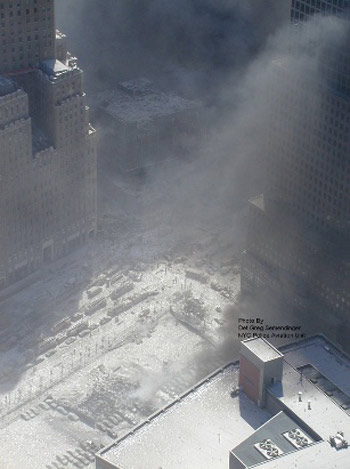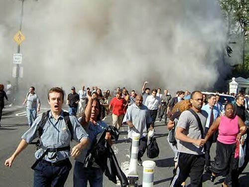 | Nhiều người khác đang ở các tầng lầu cao hơn điểm va chạm (nơi máy bay đâm vào toà nhà) cố chạy ngược lên mái toà nhà với hy vọng sẽ được trực thăng đến cứu. Nhưng không có kế hoạch cứu hộ nào được lập ra cho một tình huống như thế. Những người khác bị chặn lại bởi cửa đã bị khoá chặt khi họ đang cố leo lên mái toà nhà. |