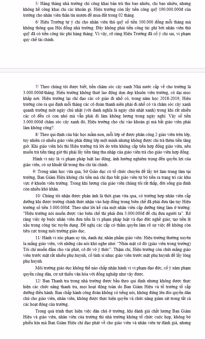 Tháng 8 vừa qua, 11 giáo viên của trường đã đứng đơn tố cáo hiệu trưởng nhà trường Nguyễn Thị Thanh Liêm vi phạm 12 nội dung về công tác quản lý và thu chi tài chính.