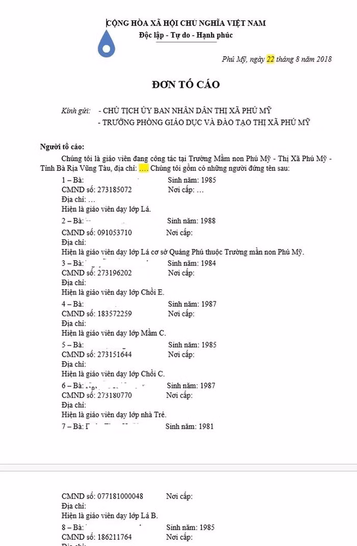 | Tháng 8 vừa qua, 11 giáo viên của Trường Mầm non Phú Mỹ đã đứng đơn tố cáo hiệu trưởng Nguyễn Thị Thanh Liêm vi phạm 12 nội dung về công tác quản lý và thu chi tài chính. Ảnh do tác giả cung cấp |