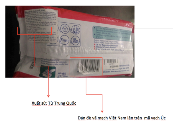 Đối với sản phẩm khăn ướt bán chạy nhất của Việt Úc là BabiCare, loại thì ghi “Made in Singapore” sản xuất bởi công ty Kleen- Pak Products Pte.Ltd, loại thì ghi rõ nguồn gốc xuất xứ Trung Quốc song mã vạch thì rất lộn xộn, cái của Việt Nam, cái của Úc.