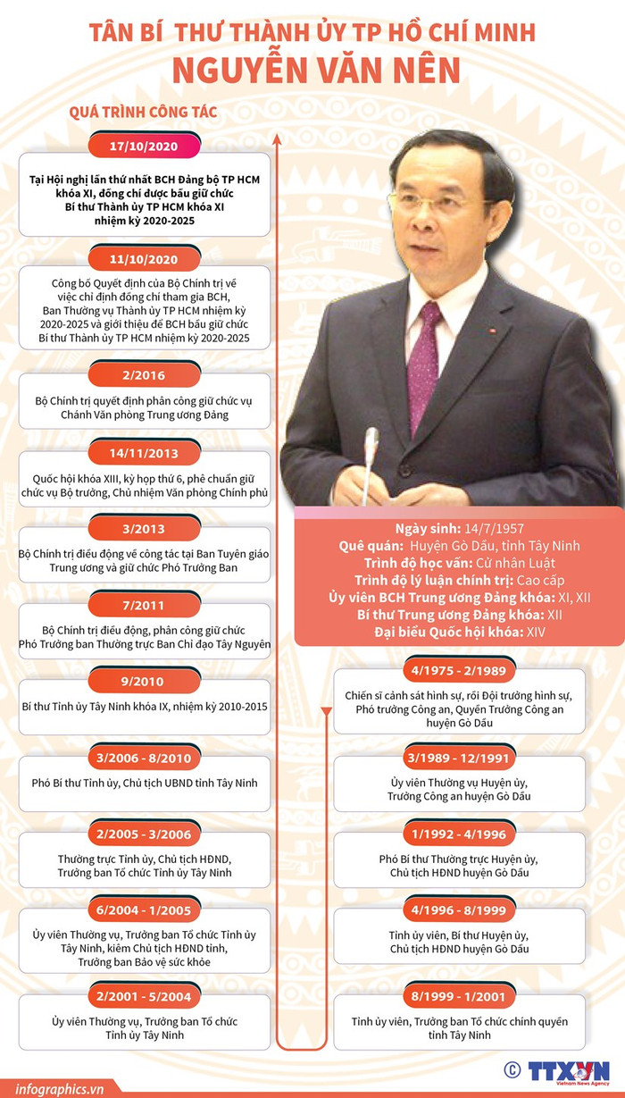 Ngày 11/10 vừa qua, Bộ Chính trị quyết định ông Nguyễn Văn Nên, Bí thư Trung ương Đảng, Chánh Văn phòng Trung ương Đảng thôi giữ chức Chánh Văn phòng Trung ương Đảng. Đồng thời chỉ định tham gia Ban Chấp hành, Ban Thường vụ Thành ủy Thành phố Hồ Chí Minh nhiệm kỳ 2020-2025 và giới thiệu để Ban Chấp hành bầu giữ chức Bí thư Thành ủy Thành phố Hồ Chí Minh nhiệm kỳ 2020-2025.