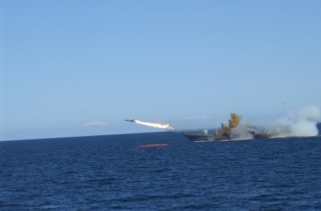 | Tên lửa chống ngầm P-15 "Termit" được phóng đi từ tàu tên lửa R-129 |