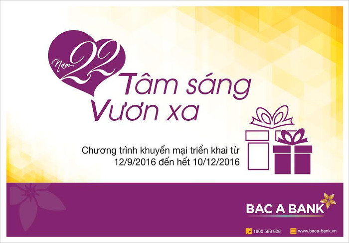 Kỉ niệm 22 năm thành lập (17/09/1994 - 17/09/2016), Ngân hàng TMCP Bắc Á (BAC A BANK) thực hiện Chương trình khuyến mại “Tâm sáng vươn xa” thay lời cảm ơn sâu sắc gửi tới Quý khách hàng đã luôn dành trọn tin yêu cho BAC A BANK suốt nhiều năm qua.