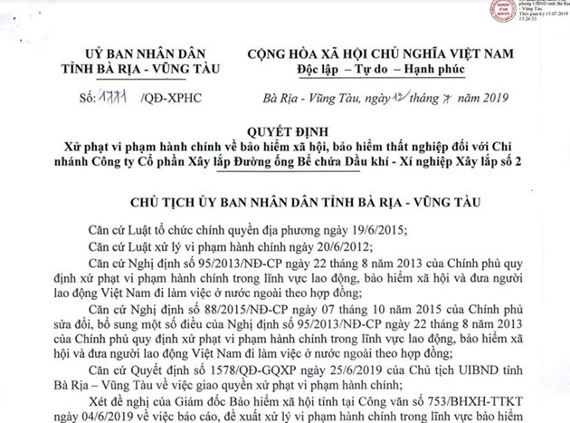 Theo đó, 3 doanh nghiệp bị xử phạt là Công ty Cổ phần Thương mại và Dịch vụ Đức Tín Thành Vũng Tàu (hoạt động trong lĩnh vực cung cấp xuất ăn, vệ sinh công nghiệp) với số tiền hơn 83 triệu đồng; Chi nhánh Công ty Cổ phần Xây lắp Đường ống Bể chứa Dầu khí - Xí nghiệp Xây lắp số 2 (chuyên thi công công trình đường ống dẫn khí, dẫn ga…) với số tiền 150 triệu đồng; Công ty Cổ phần Kết cấu kim loại và Lắp máy dầu khí (chuyên chế tạo lắp đặt các kết cấu kim loại phục vụ ngành dầu khí…) với số tiền 150 triệu đồng.