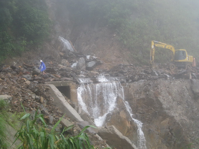 Đến đoạn cách cửa khẩu 4km, tuyến đường huyết mạch này bị cắt đứt gần 200m. Dưới chân núi bên taluy dương, 30 du khách nước ngoài mắc kẹt trên ốc đảo Cầu Treo từ hôm 16-10 được bộ đội biên phòng dẫn đường. Giữa bức vách đang đổ nghiêng xuống, có du khách không dám nhìn vực thẳm nơi cung đường bị cắt đứt. Có du khách níu chặt cây rừng nhìn nhanh rồi bước theo con đường mòn mới được biên phòng mở lối.
