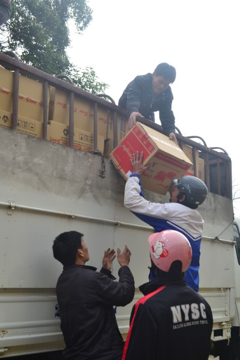 | 9h30 đoàn từ thiện đến xã Quài Nưa, thành viên đoàn phối hợp với người dân dỡ hàng. |