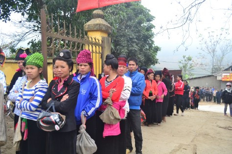 | Người dân có mặt từ sáng sớm để đón đoàn từ thiện đến với tâm trạng vui vẻ. |