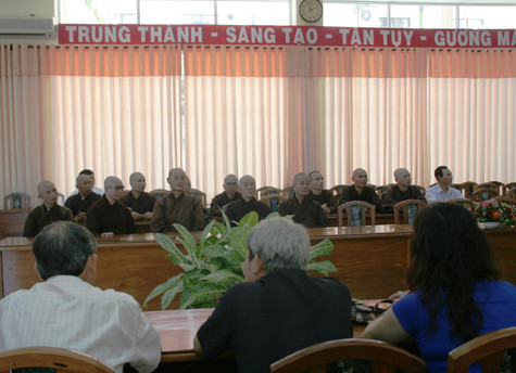 | Hoà thượng Nguyễn Quang (người mang kính) tiễn các tăng sĩ ra Trường Sa. |