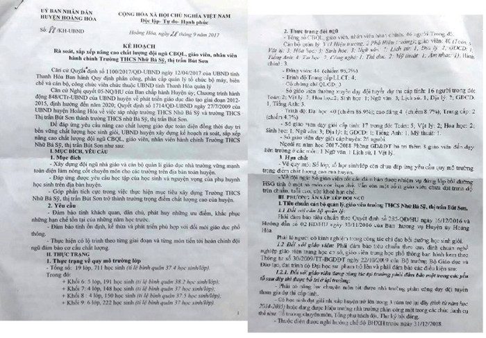 Các giáo viên phản ánh đến Báo Điện tử Giáo dục Việt Nam cho biết, ngày 28/09/2017, Ủy ban nhân dân huyện Hoằng Hóa có văn bản số 88/KH-UBND về kế hoạch rà soát, sắp xếp nâng cao chất lượng đội ngũ cán bộ quản lý, giáo viên, nhân viên hành chính Trường trung học cơ sở Nhữ Bá Sỹ.