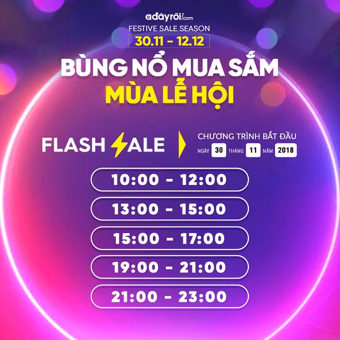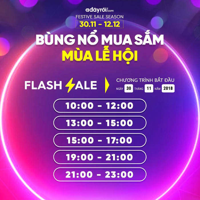 Chương trình “Bùng nổ mua sắm mùa lễ hội” từ ngày 30/11 – 12/12/2018 sẽ đem đến cho khách hàng mỗi ngày 5 khung giờ “săn sale” hấp dẫn trên Adayroi.