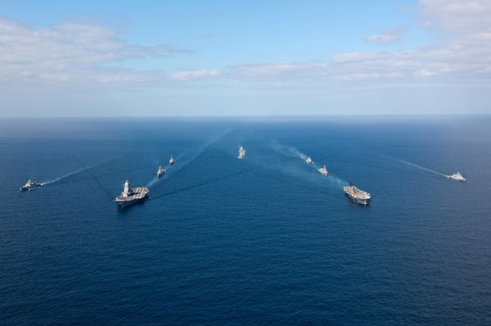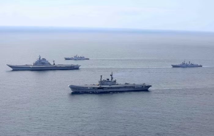 | Hai biên đội tàu sân bay của Hải quân Ấn Độ chạy trên biển |