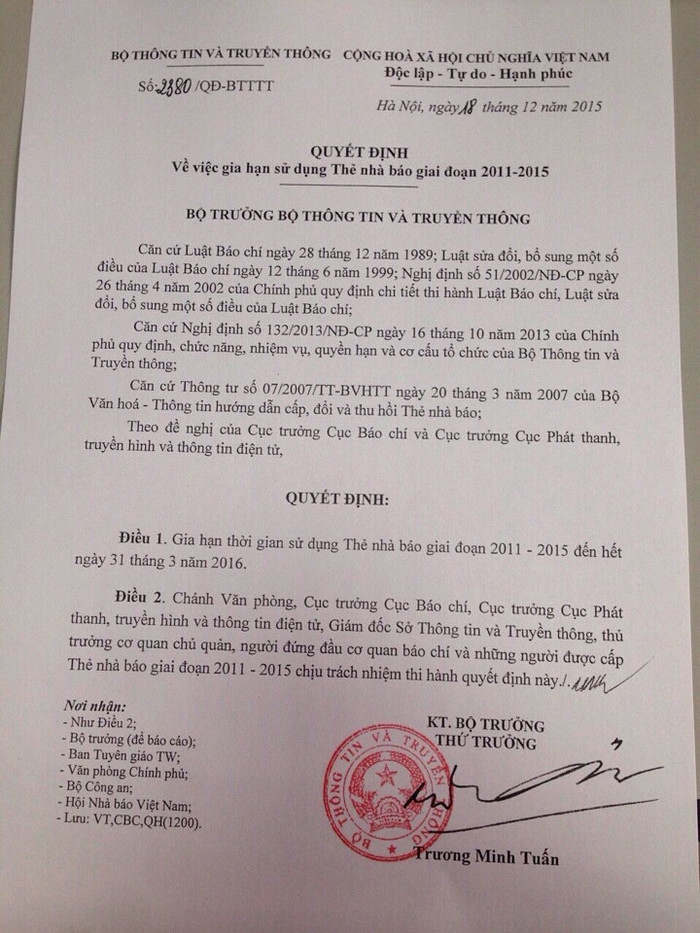 | GIA HẠN THỜI GIAN SỬ DỤNG THẺ NHÀ BÁO ĐẾN HẾT THÁNG 3/2016 Ngày 18/12/2015, Bộ Thông tin và Truyền thông có Quyết định số 2380 gia hạn thời gian sử dụng Thẻ nhà báo giai đoạn 2011-2015 đến hết ngày 31/3/2016. Theo quy định, Thẻ nhà báo 2011-2015 có giá trị sử dụng ghi trên thẻ đến hết ngày 31-12-2015. Việc cấp, đổi thẻ đã được bộ TT&TT hướng dẫn và thực hiện xong trước thời hạn này.