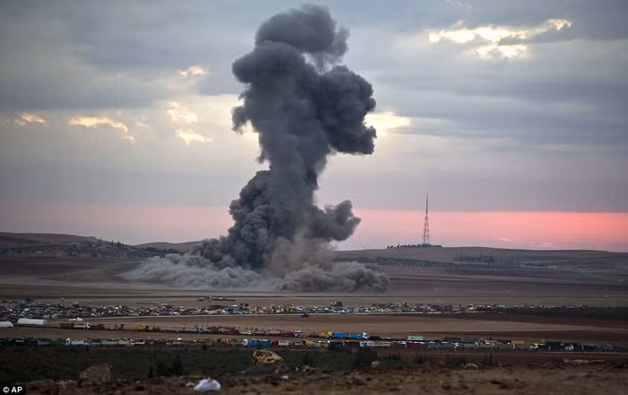 | Khói và bụi bay lên từ một mục tiêu không kích của lực lượng Mỹ tại Kobani. |