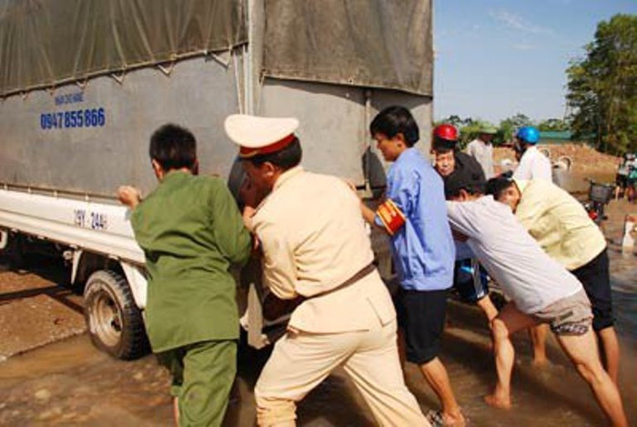 | Trung úy Nguyễn Mạnh Phan, Đội CSGT Công an huyện Ba Vì phải mạo hiểm cả tính mạng của mình để làm nhiệm vụ. |