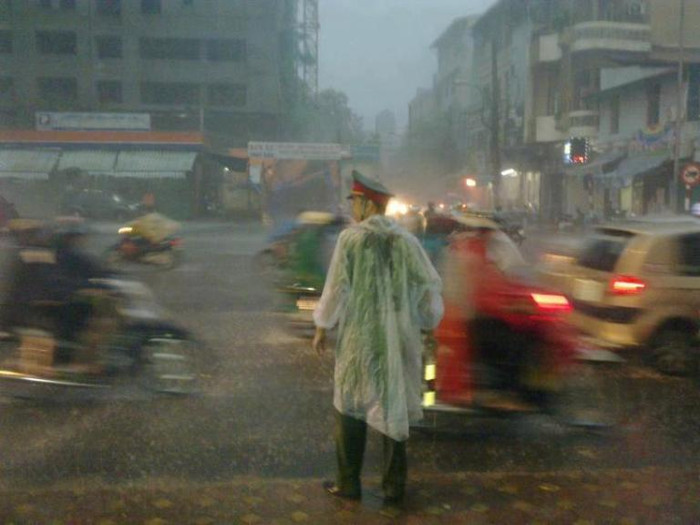 | Lực lượng cảnh sát giao thông ra sức khắc phục sự cố sau mưa bão. |