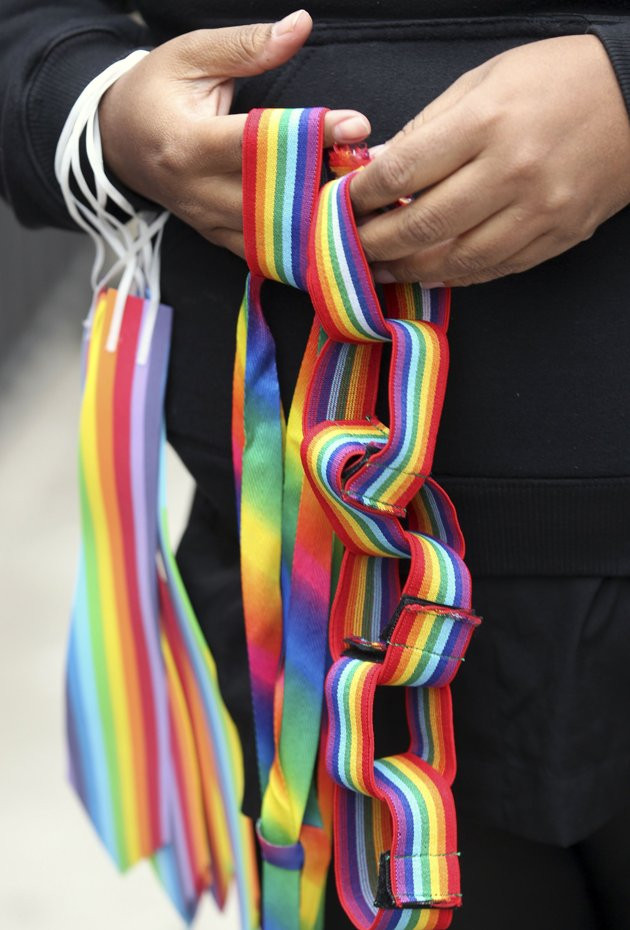 | Họ còn đem thêm những lá cờ khổng lồ được gọi là cờ cầu vồng của người đồng tính. |