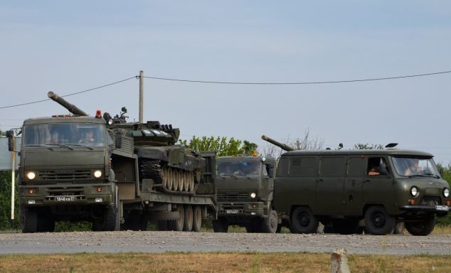Theo Daily Mail ngày 19/9, một đoàn xe vận tải quân sự Nga được nhìn thấy chở theo xe tăng T-90 và xe thiết giáp đi qua khu vực Rostov hướng về phía biên giới với Ukraine.