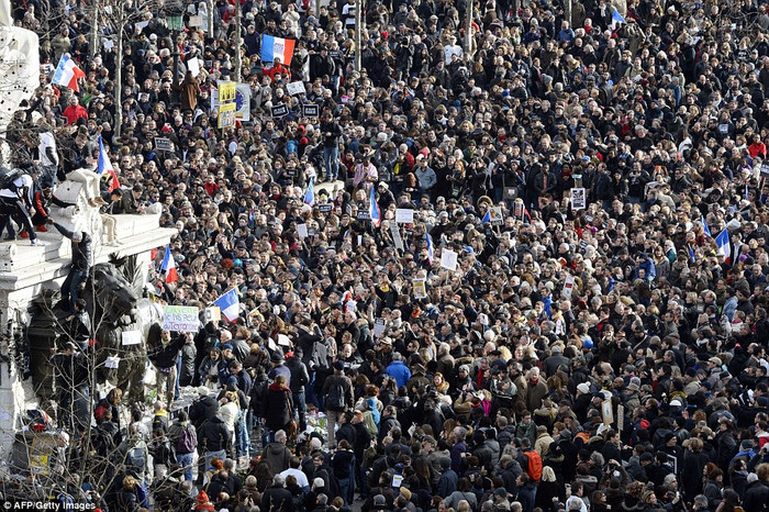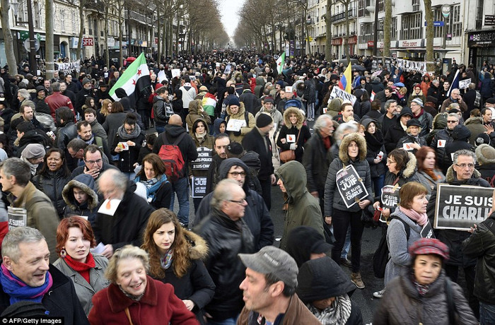 Hơn 40 nguyên thủ quốc gia và 3,7 triệu người đã tham gia cuộc tuần hành lớn nhất trong lịch sử trên khắp nước Pháp vào ngày 11/1 để bảy tỏ sự ủng hộ tự do và phản đối các cuộc tấn công khủng bố liên tiếp ở Paris giết chết 17 người hồi tuần trước.