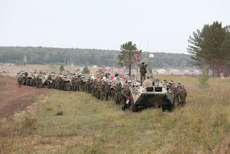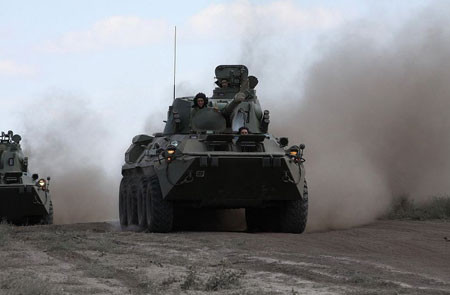 | Cuộc tập trận Indra 2012 có sự tham gia của khoảng 500 binh sĩ của cả hai bên. Một trong nội dung tập trung, tập huấn khả năng vận hành phương tiên chiến đấu do Nga chế tạo. Trong ảnh, binh sĩ Ấn Độ đứng trên các xe chiến đấu bộ binh BMP-2. |