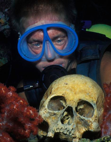 Một thợ lặn đang quan sát hộp sọ của một binh sĩ Nhật Bản.