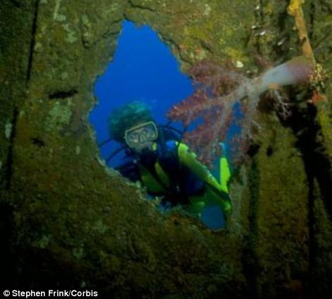 Một thợ lặn khám phá hầm chứa hàng của tàu Kenshu.